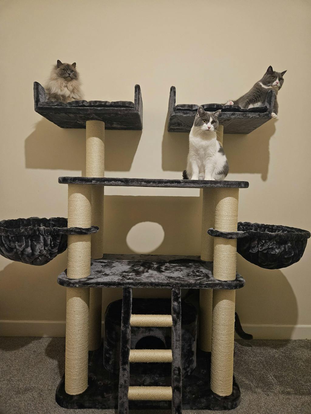 Og ja, vi har lyttet til dig (og andre kunder). ‘Mine katte kæmper nogle gange om, hvem der må ligge højest, der er sådan en dejlig pude i’. På grund af de to store liggepladser har hver kat sit eget sted. Ingen flere skænderier om, hvem der må ligge højest!