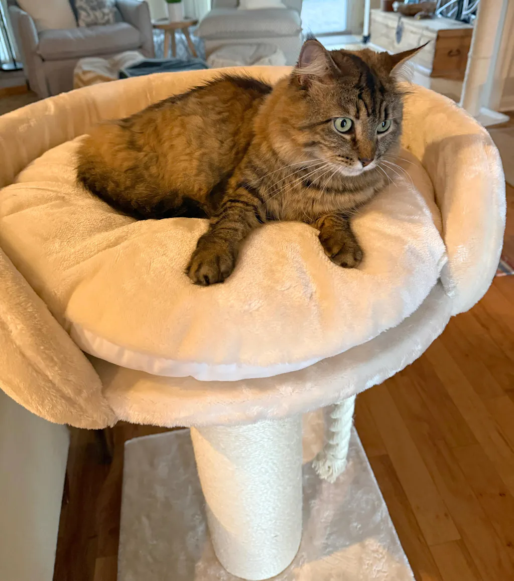 This lounger is exactly what I needed for my 2 fur babies to snuggle up, and wrestle, with each other without over crowding and one being launched over the edge accidentally. The platform is so spacious and comfy, they absolutely love it. Thank you Cat Tree King for another awesome product.