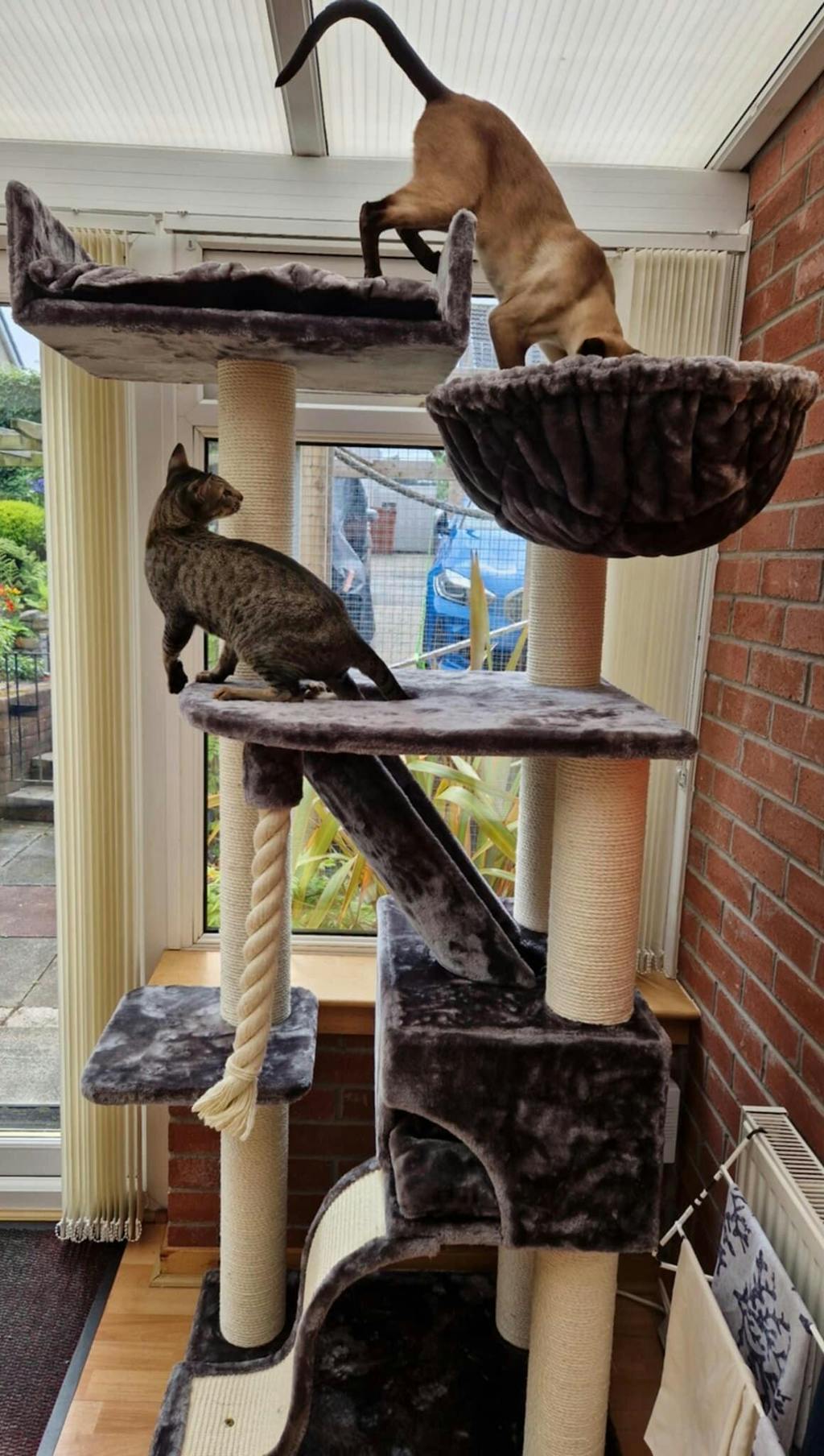 Alle Plateaus und Liegeplätze sind vollständig mit dichtem und weichem 600-Gramm-Plüsch bezogen, was jedes Plateau zu einem ausgezeichneten Spielplatz für Ihre Katze macht, zu entspannen oder zu schlafen. Mit einer Höhe von gut 1,90 Metern kann Ihre Katze hier ihr Reich von hoch oben betrachten.