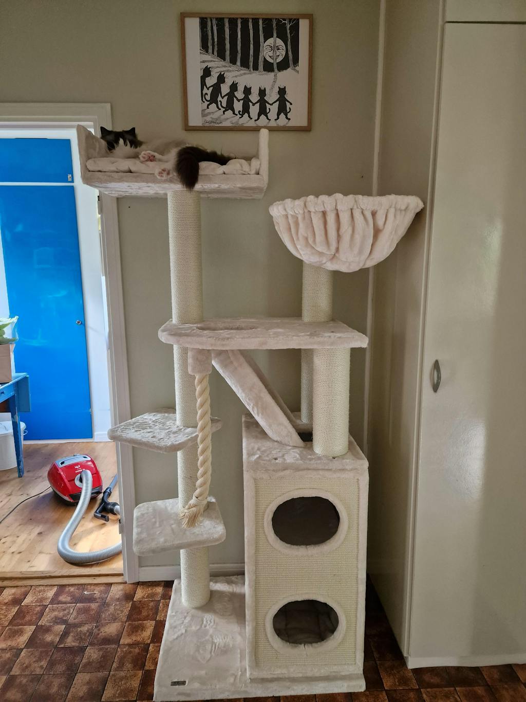 Dzięki wysokości prawie 2 metrów (1,95 m) Twoje koty będą mogły z tego miejsca doskonale obserwować swoje terytorium. Jest też ogromny drapak o wymiarach 80 x 40 x 55 cm z 2 dużymi wejściami o średnicy 20 cm, który jest w całości pokryty wysokiej jakości sizalem. Jest wyposażony w 1 cudownie grubą poduszkę, dzięki czemu Twój kot może się wygodnie wylegiwać lub chować na jednym z poziomów. Wokół drapaka Twój kot ma wystarczająco dużo miejsca, aby się wyszaleć. Dzięki 8 (!) słupkom z sizalu o średnicy aż 12 cm, z których 6 ma co najmniej 40 cm długości, kot może drapać i dbać o paznokcie naprawdę wszędzie. Podsumowując, ten drapak oferuje ogromną liczbę możliwości drapania, co z ergonomicznego punktu widzenia jest ważne dla stawów kota.