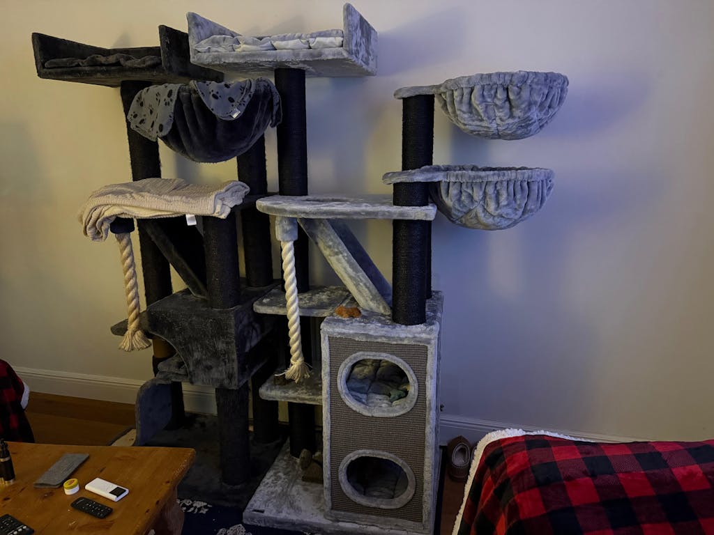 Avec ses poteaux en sisal de 12 cm d'épaisseur, son immense fauteuil Lounge, son griffoir solide et robuste dans la partie inférieure et ses deux hamacs luxueux, le Cat Penthouse Plus convient aux plus grandes races de chats telles que le Maine Coon, le chat des forêts norvégiennes et le persan. Il peut accueillir sans aucun problème jusqu'à 7 chats en même temps.