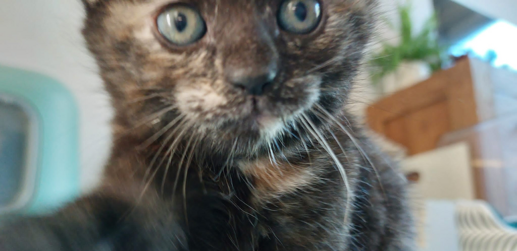 Lefty, uma gatinha tartaruga de quase 7 semanas, com uma mistura de vermelho e preto e a sua pata traseira esquerda é vermelha.