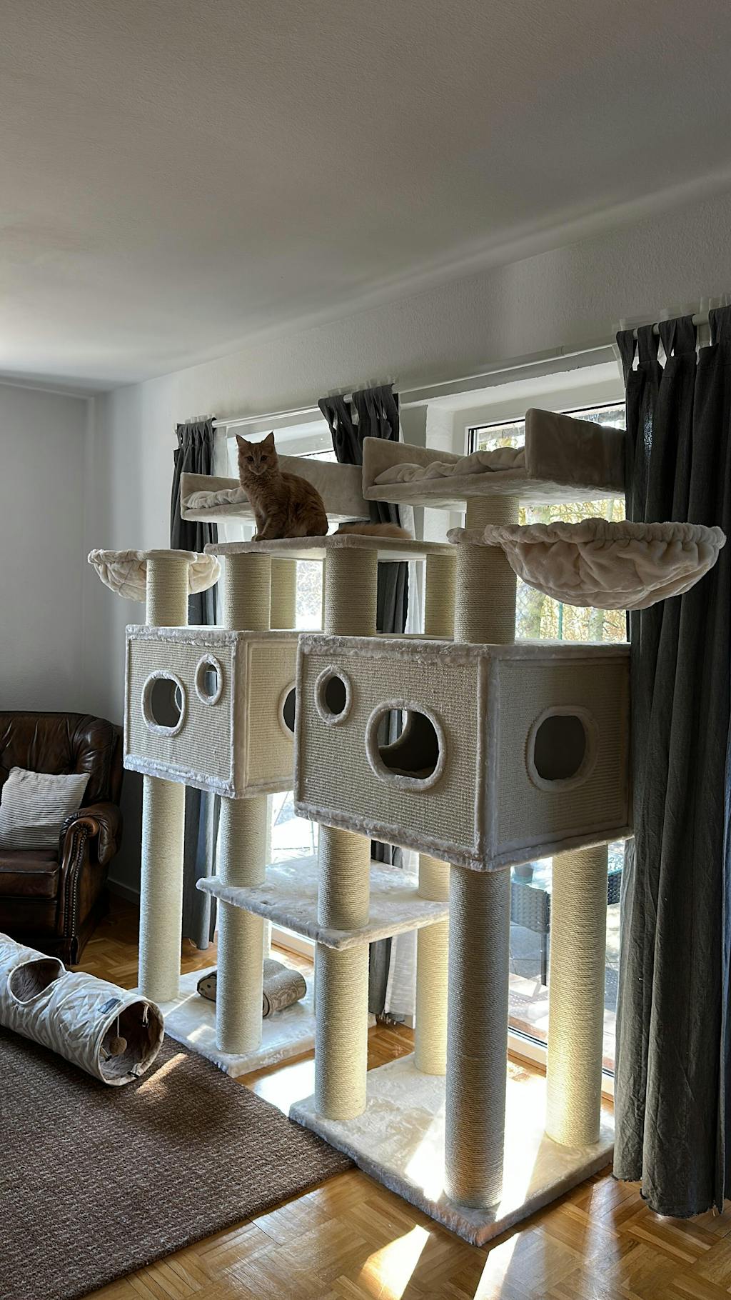 Alla plattformar och liggplatser i Royal Cat Palace är helt klädda med härligt, tjockt och mjukt 600 g/m2 plysch, vilket gör varje plattform till en fantastisk plats att leka, koppla av eller sova på. Tack vare höjden på nästan 2 meter (1,95 meter) är det naturligtvis fantastiskt för dina katter att kunna övervaka sitt revir därifrån.